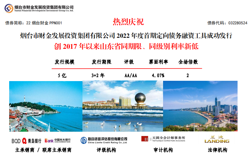 6月8日,煙臺財金集團2022年度首期定向債務(wù)融資工具(PPN)在中國銀行間市場交易商協(xié)會成功發(fā)行!發(fā)行規(guī)模5億元,期限3+2年,票面利率4.07%,全場認(rèn)購倍數(shù)2倍,創(chuàng)2017年以來山東省同期限、同級別利率新低。本期債券發(fā)行由青島銀行牽頭主承,光大銀行聯(lián)席主承,聯(lián)合資信、天圓全會計師事務(wù)所及蘭迪律師事務(wù)所分別提供信用評級、審計和法律服務(wù)。