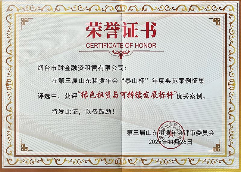 近日,煙臺財金集團(tuán)旗下財金融資租賃有限公司在第三屆山東租賃年會“泰山杯”年度典型案例評選中,喜獲“綠色租賃與可持續(xù)發(fā)展標(biāo)桿案例”榮譽稱號。